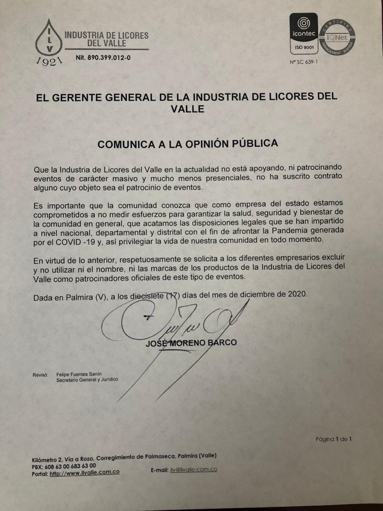 El Gerente General de la Industria de Licores del Valle comunica a la opinión pública que en la actualidad no está apoyando, ni patrocinando eventos de carácter masivo y mucho menos presenciales, no ha suscrito contrato alguno cuyo objeto sea patrocinio de eventos.