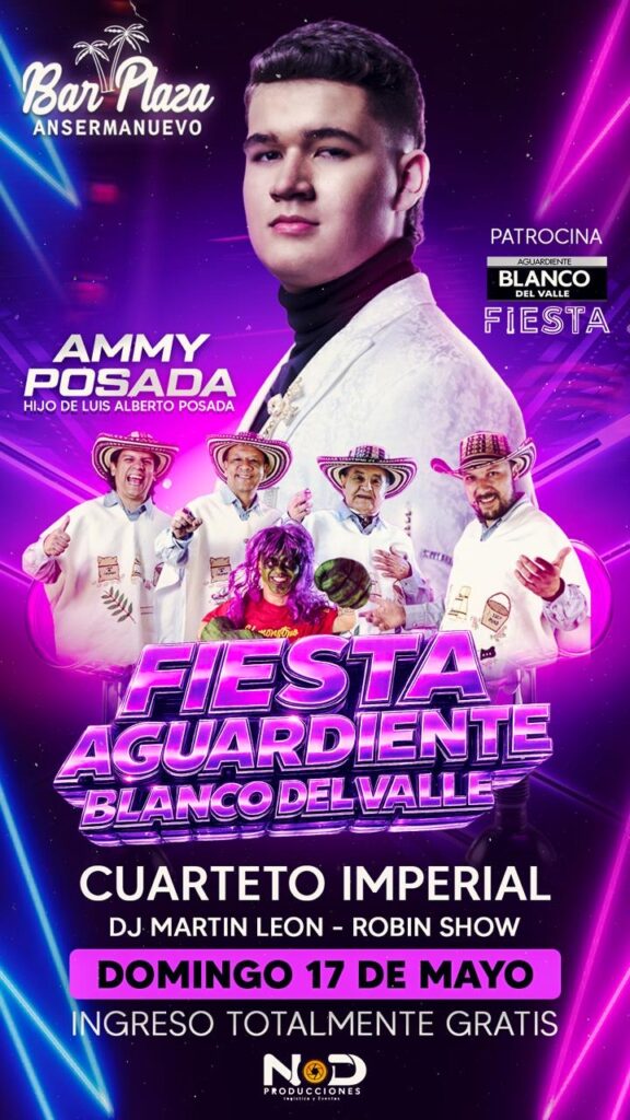 La Fiesta Aguardiente Blanco del Valle Concierto se llevará a cabo el próximo 17 de mayo, reuniendo en un mismo escenario al Cuarteto Imperial, DJ Martin León, Robin Show y Ammy Posada. Un encuentro musical que integrará diversos ritmos y propuestas artísticas, ofreciendo al público una experiencia dinámica y llena de entretenimiento.