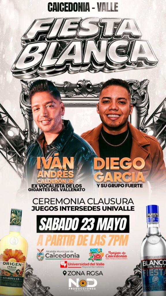 El Aguardiente Blanco del Valle acompañará la Fiesta Blanca en Caicedonia, en el marco de la ceremonia de clausura de los Juegos Intersedes de la Universidad del Valle. El próximo sábado 23 de mayo, reconocidos artistas como Iván Andrés Calderón Jr. y Diego García serán los encargados de poner el ritmo a una velada especial que reunirá música, celebración y tradición.