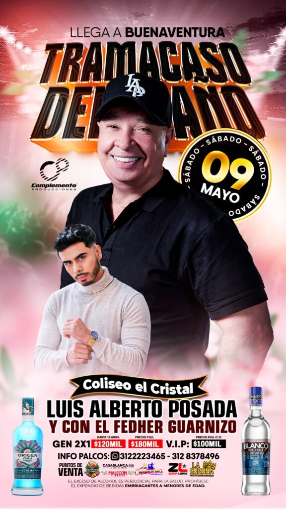 El Aguardiente Blanco del Valle será patrocinador del Tramacaso del Año, un evento que llegará a Buenaventura el próximo 9 de mayo de 2026 en el Coliseo Cristal. En esta ocasión, el público podrá disfrutar de las presentaciones de Luis Alberto Posada y Fedher Guarnizo, en una noche que promete grandes emociones y lo mejor de la música popular.